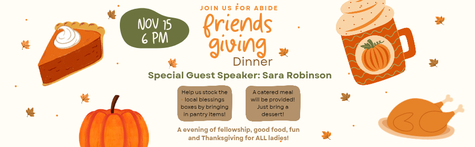 Hey ladies! Join us for Abide Friendsgiving at Mill Creek's Fellowship Hall. This incredible event is for all ladies in the community. We will have an amazing meal and have a special guest speaker, Sara Robinson. There will be giveaways and photo opportunities. We are collecting pantry food items to fill our local blessing boxes, so it would be a huge help if you could bring some pantry items. A catered meal will be provided. Just bring a dessert!